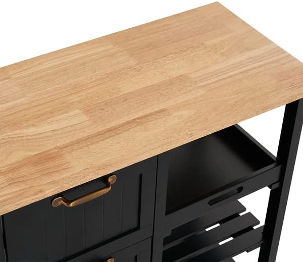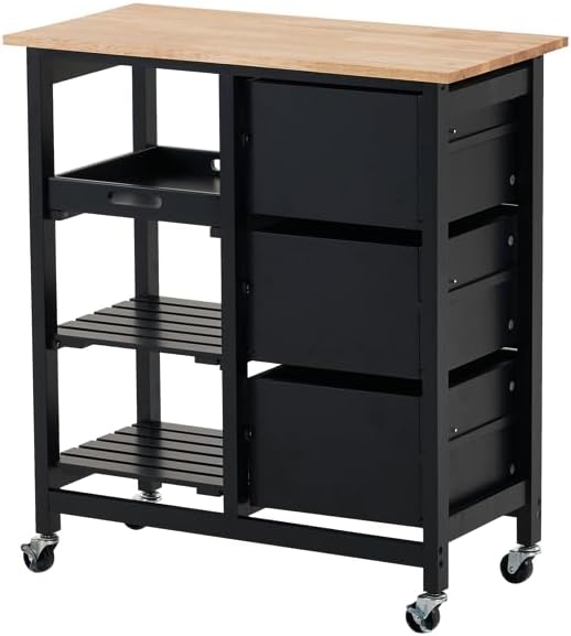 Introductions:Here is our 76*37*84cm Three Drawers Three Layers Bronze Color Handle Rubber Wood Log Color Table Top Black Spray Paint Dining Car. If you want to have a simple and practical dining car, this will be your best choice!Features:1. Fully functional: This kitchen dining cart has many uses, in addition to being used as a kitchen, it can also be used as a service station for sideboards, cafes/tea rooms, etc., bar carts, wine carts, workstations in restaurants.2. Easy to store: This dining cart has a tray; 2 shelves; 3 drawers and a spacious table top, providing you with enough storage space. A solid wood tabletop is a great surface to prepare food or place a variety of kitchen utensils.3. Quality assurance: rubber wood P2 medium density fiberboard, solid wood table top, durable. Natural wood finish is suitable for any decoration; spraying treatment is moisture-proof, durable, lightweight and easy to assemble, environmentally friendly and safe.Specifications: 1. Dimensions: (14.6 x 30 x 33)" / (37.08 x 76.2 x 83.82)cm(D x W x H)2. Weight: 35.27lbs / 16Kg 3. Color: Black4. Shelf Type: Layered Shelf 5. Material: Engineered Wood, Rubber Wood MDFPackage Includes:1 x Dining Car